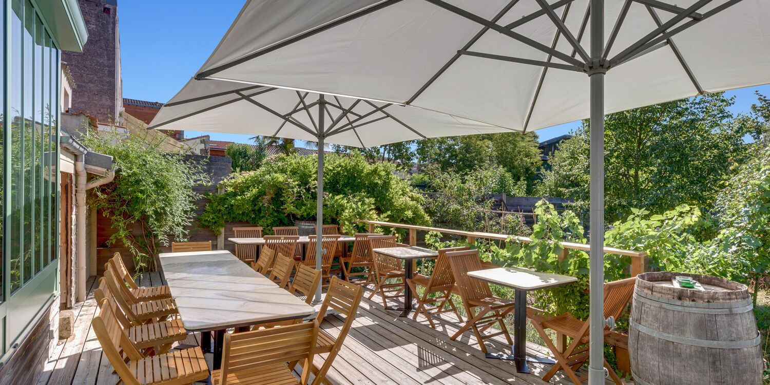 Traversez la cave et découvrez notre bar à vins caché avec son ambiance intimiste et sa terrasse sur le jardin.